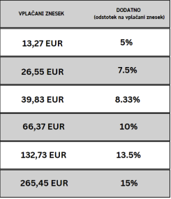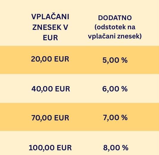 - Z izvedbo plačila je uporabnik upravičen do bonusa v denarnem znesku v skladu s tabelo:
